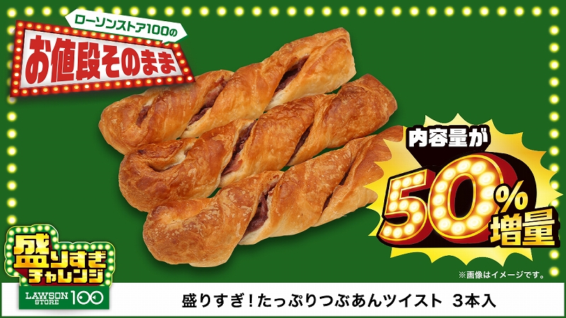 ローソンストア100で、お値段は変わらず50%増量になる『盛りすぎチャレンジ』が実施されてます。1週間ごとに商品が変わり全部で第4弾まで予定されています。