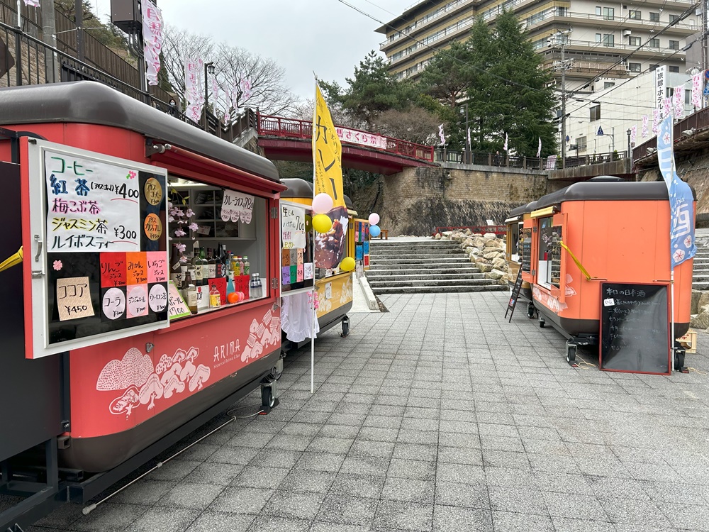 見頃にあわせて開催される「有馬さくら祭」では、芸妓衆の踊りや伝統芸能猿まわし、マジックショーなどのステージが催されます。屋台では、たこやきやおでん、フライドポテト、唐揚げ、ドリンクなどが登場するみたいです。
