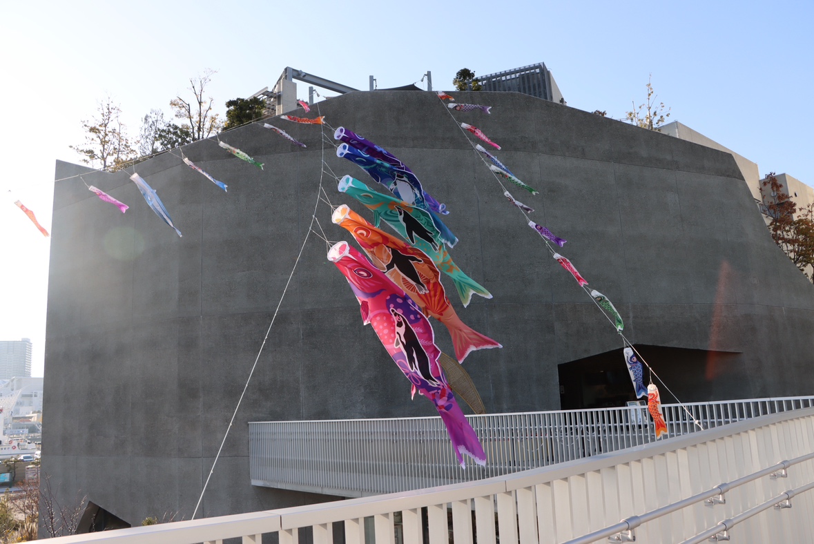 鯉のぼりに大きくあしらったのは、金太郎ではなくフンボルトペンギンです。まさに生きものとアートが融合した世界のどこにもない鯉のぼりです。