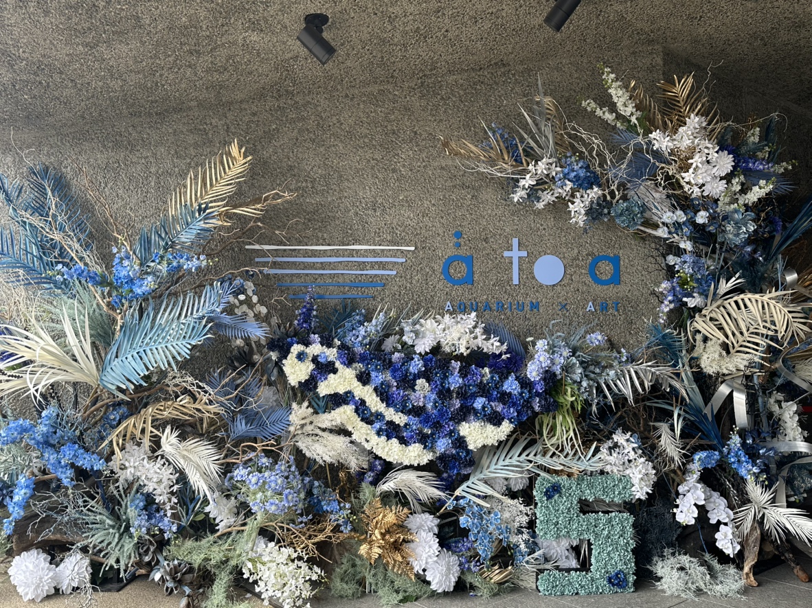 アトアのロゴ前にはフォトスポットが登場。フラワーアレンジメ ントで“5周年=ゴール”ではなく、ここからさらに深く美しく進化していく姿を表現しています。深海に差し込む光が空間を巡り、未来へと続く世界観を演出しているそう。