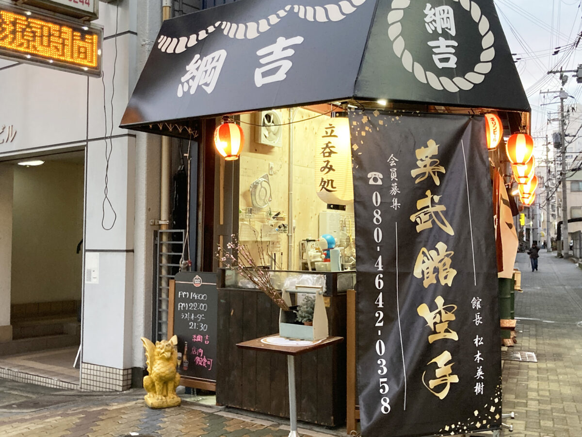 2026年2月にオープンした『綱吉』。たこ焼き8個400円、おでん1皿500円などが食べられる立ち飲み店です。
