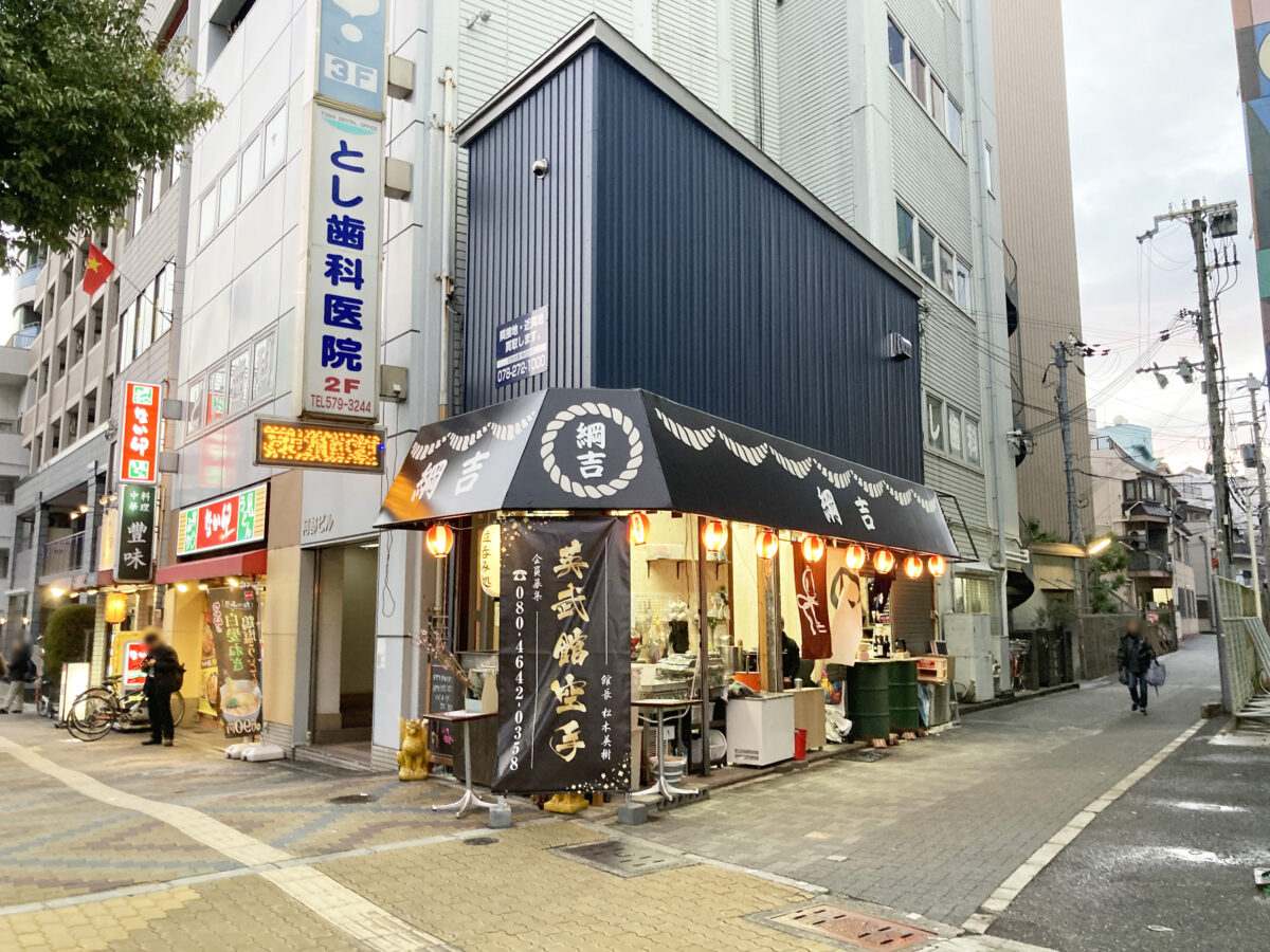 『綱吉』ができたのは、新開地商店街の少し西。パチンコ店が入るカラフルな「聚楽館ビル」のすぐ横です。