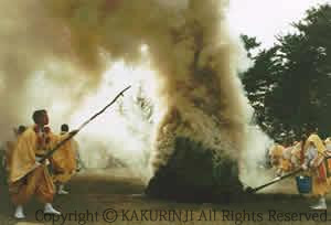 採灯護摩供(さいとうごまく)では、付近の行者衆が一堂に会して「世界平和」と人々の「心願成就」を祈ります。