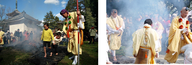 終了後に、炎の残る壇木を並べて、その上を裸足で歩いて渡る「火渡りの儀」を体験できます。誰でも参加可能みたいですよ。
