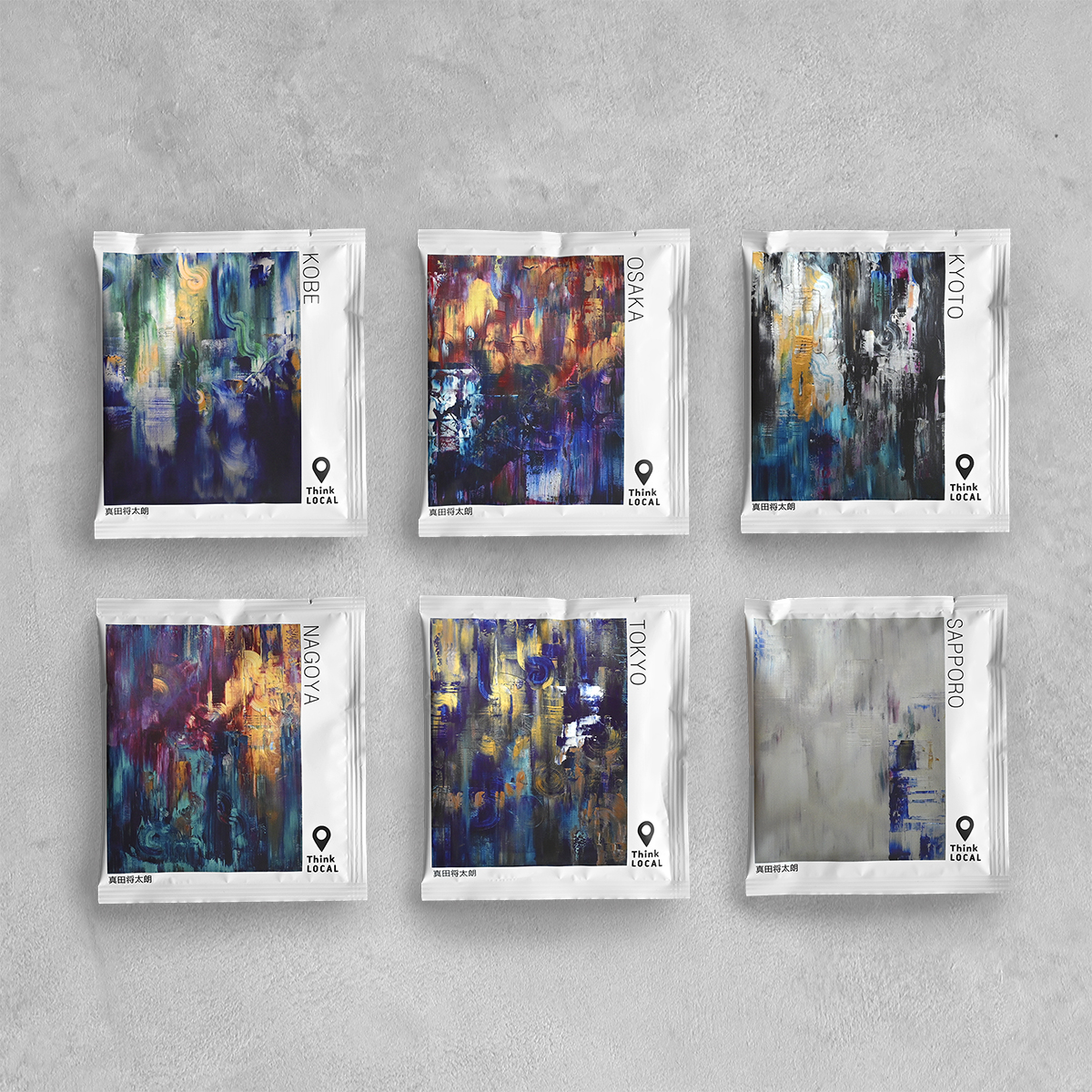 真田将太朗氏が、各都市の風景を取り巻く重力や時間からインスピレーションを受けた「抽象絵画」をパッケージにあしらったドリップバッグ。