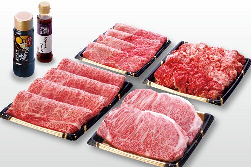 ・松阪牛と柿安牛は三重県産、近江牛は滋賀県産、黒毛和牛は国内産。