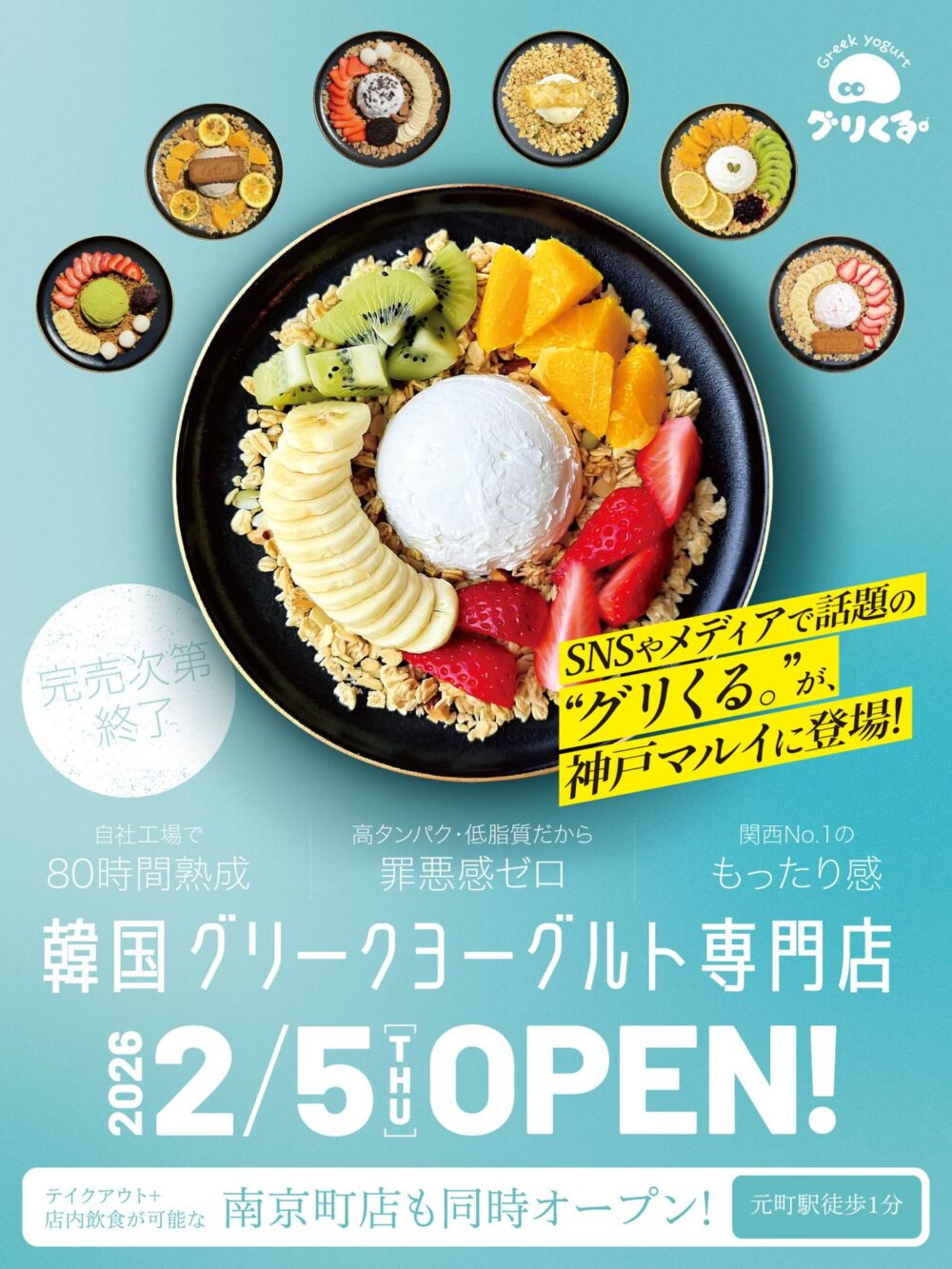 神戸マルイの1階に『グリくる。』っていう「韓国グリークヨーグルト」の専門店ができてます。オープン日は2月5日(木)です。