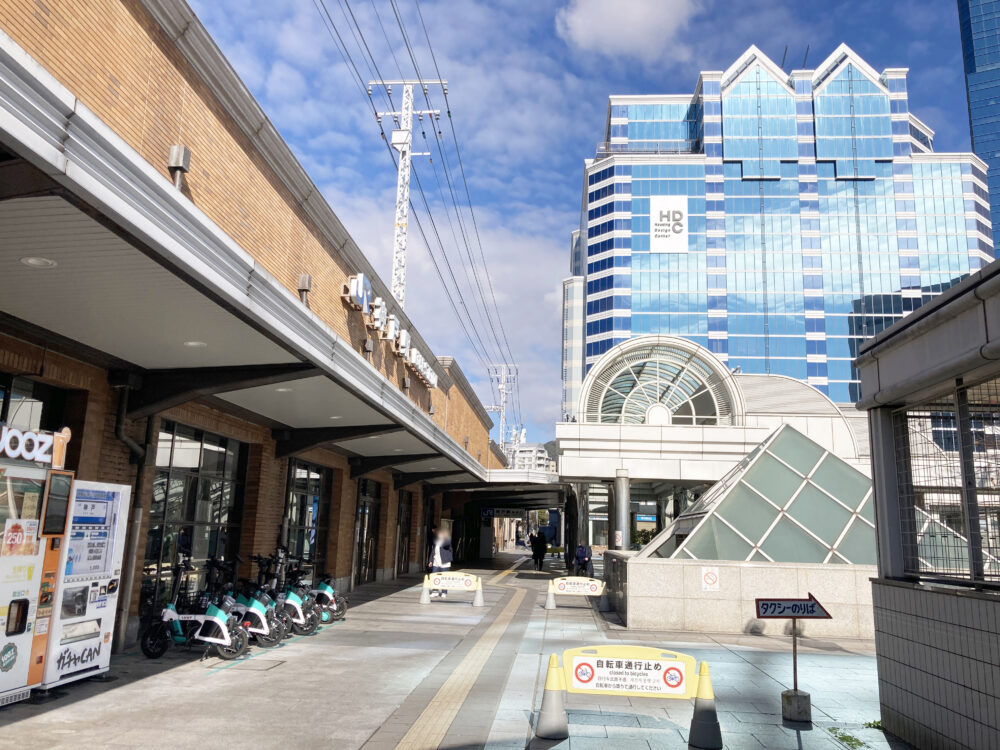 自販機が設置されたのは、JR神戸駅から海側に出てすぐのところ。東を向くと、HDC(ハウジング・デザイン・センター神戸)のビルが見えます。