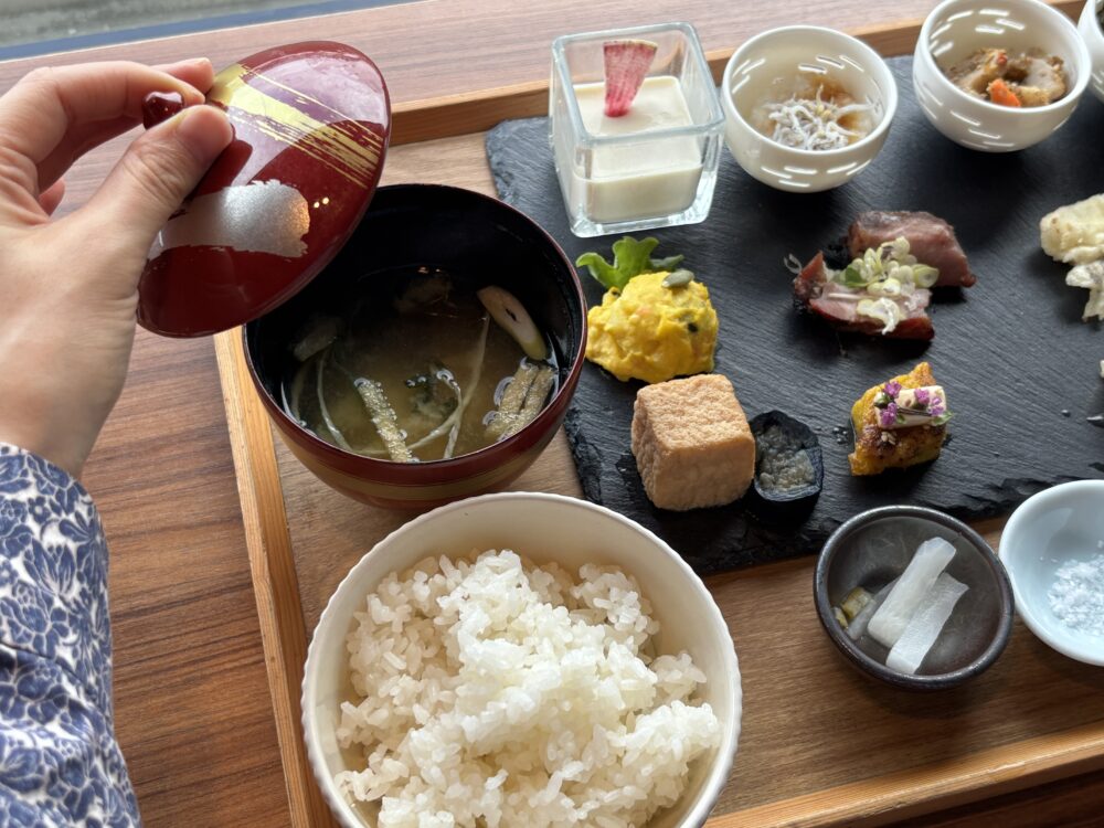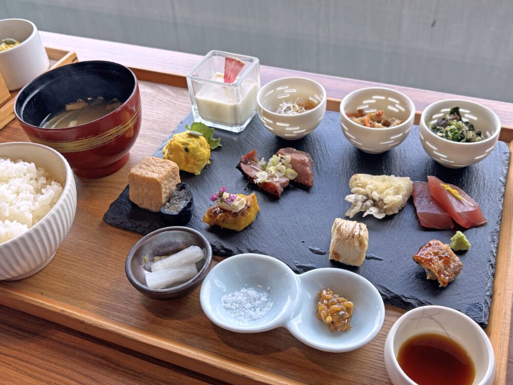 今回は、「一汁十二菜ランチ(税込2,000円)」をチョイス。「すずきのお造り」「生とうふ」「しらすおろし」「真鯛の天ぷら」「湯葉の含め煮」「生麩とクリームチーズの炙り焼き」「秋刀魚の蒲焼」「山形豚の西京焼」など、12種類の小鉢メニューがワンプレートに盛り付けられています。