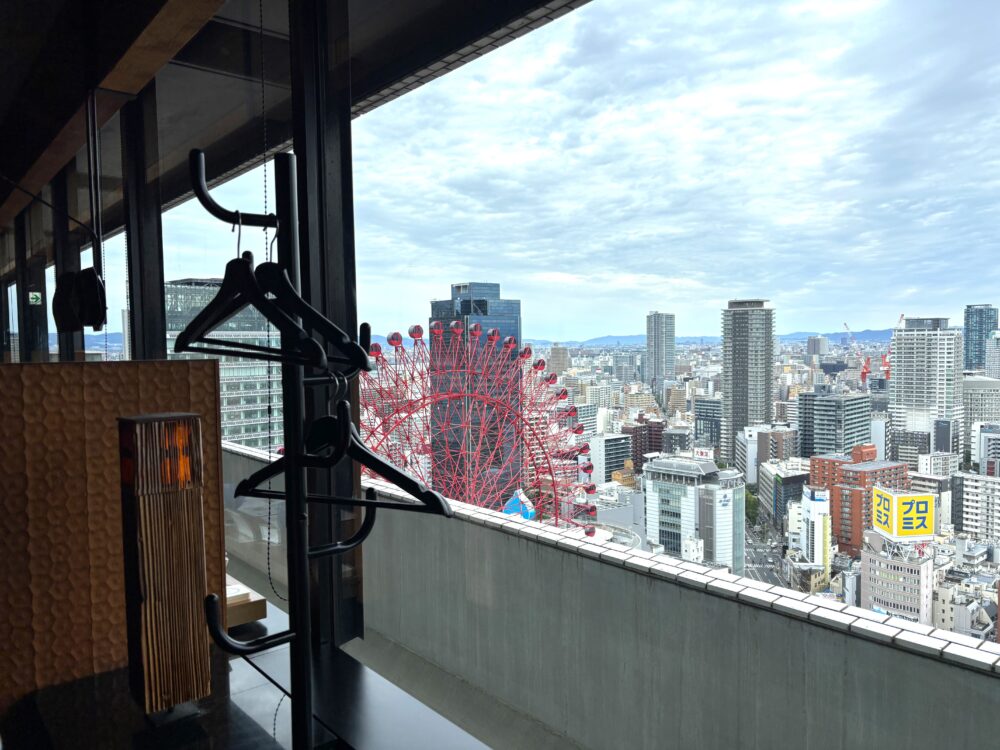店内の東側は一面ガラス張りになっていて、HEP FIVEの観覧車や多くのビルが立ち並ぶ「大阪の街」を一望できます。