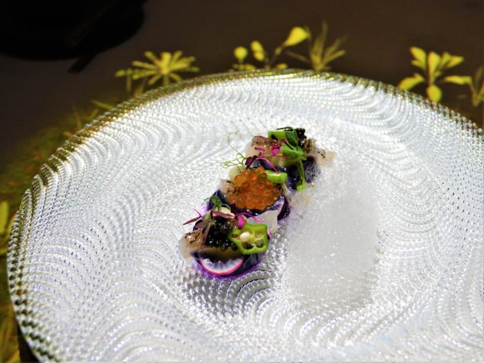 hors-d’oeuvre(オードブル)/茄子の和コンポート 真鯛の炙りとイクラとキャビア 一番出汁のカプチーノ