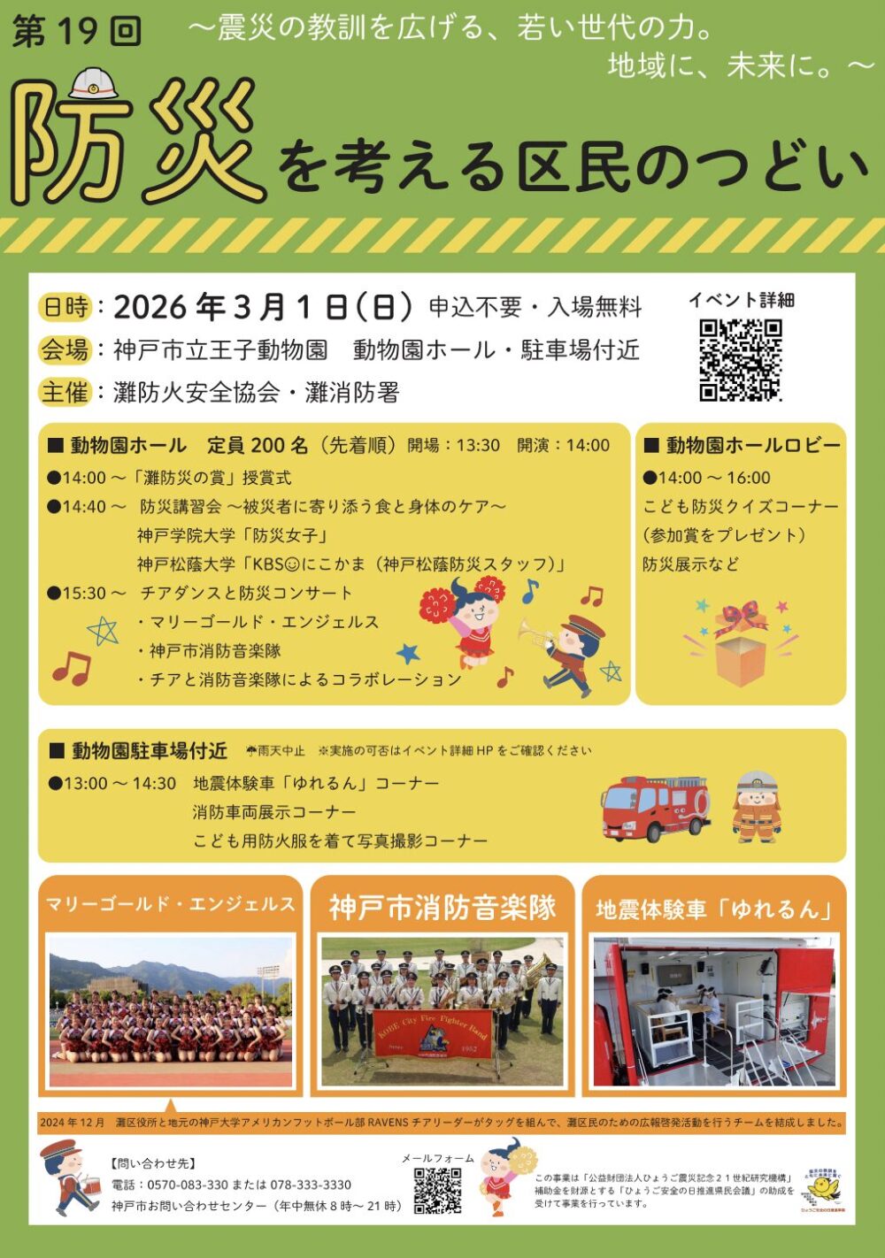 区民への防災啓発活動を行うマリーゴールド・エンジェルス(神戸大学アメリカンフットボール部RAVENSチアリーダー)と、神戸市消防音楽隊のコラボレーションによる、チアダンスと防災コンサートにも注目です。