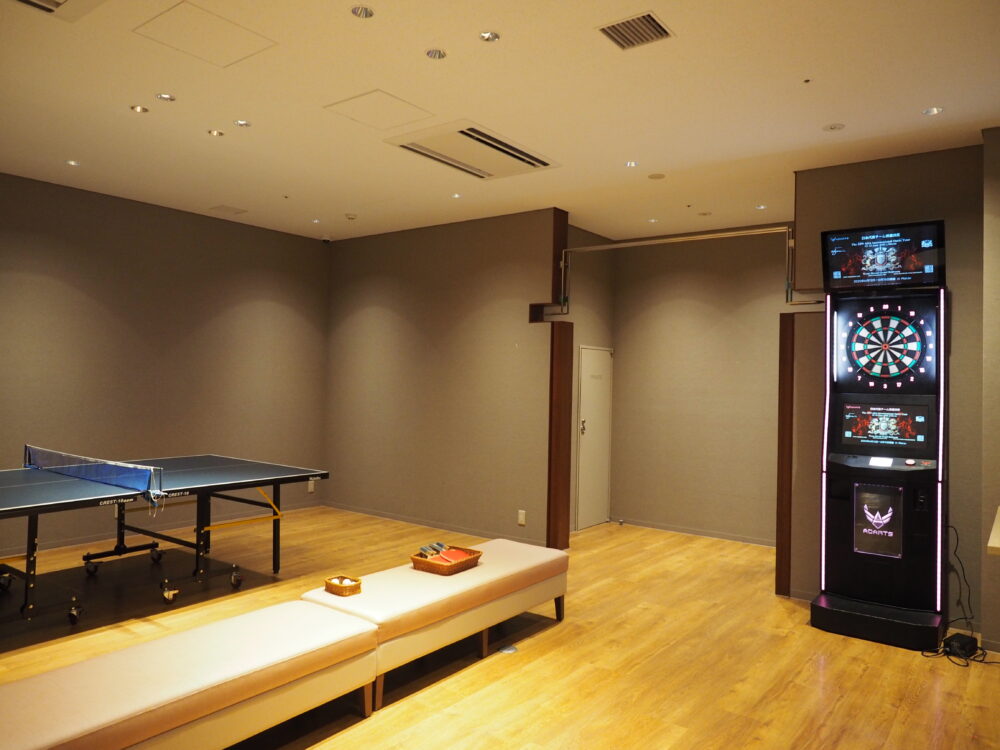 1階の娯楽室には、自由に使用できる卓球台やダーツも。少し体を動かして、満腹のお腹に余力を作ることをおすすめします。