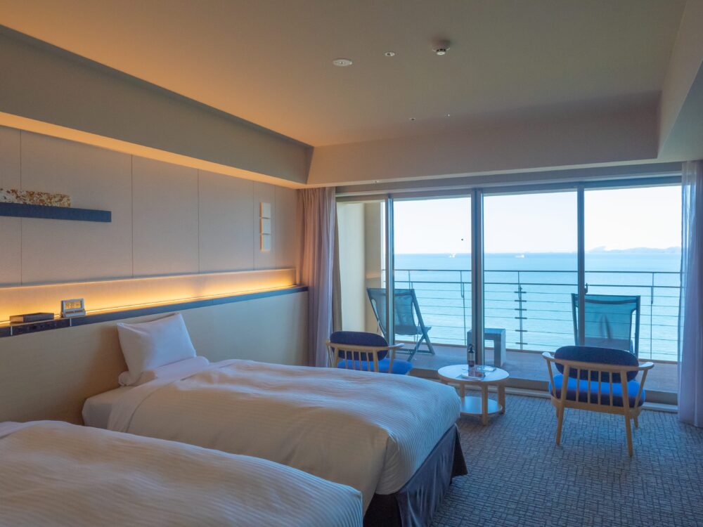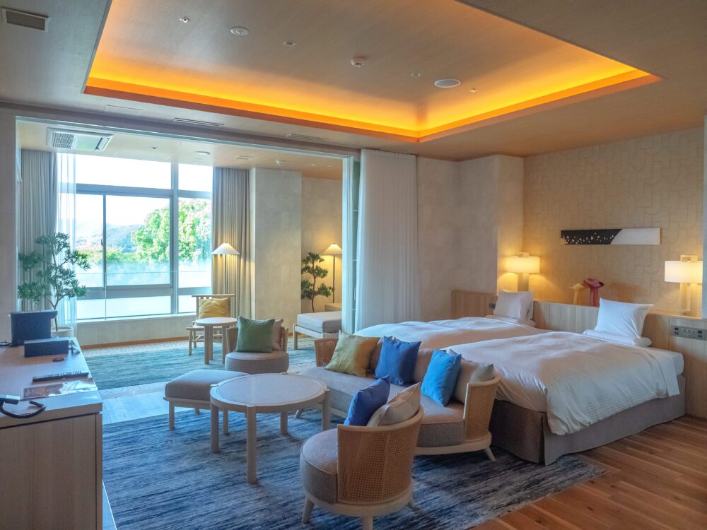 今回宿泊に選んだのは3階「デラックスルーム(温泉半露天風呂付)/50平米」。シングルベッドが2台ならんだツインタイプの山側ビューのお部屋です。