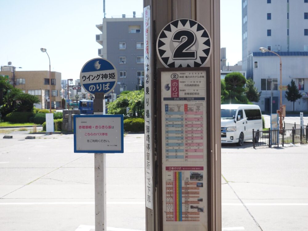 播州赤穂駅からは、ホテル行きの神姫バスが出ています。基本的に平日は1時間に1本・土日祝は2本と少なめなので、事前にチェックしておくことをおすすめします。