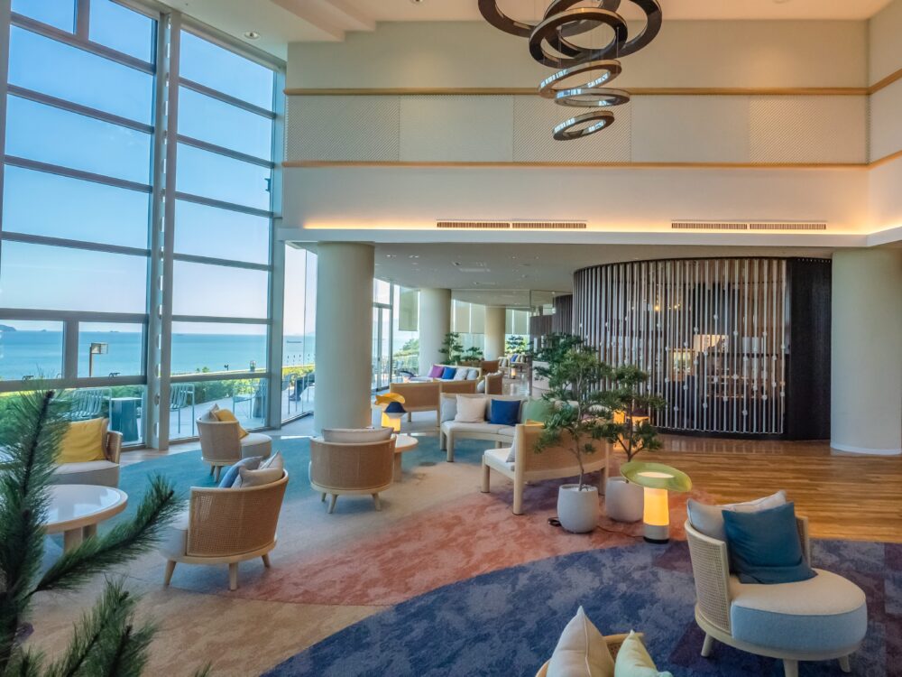 中に入るとこんな感じ。ロビーから一望できる形式は以前のままに、ソファーやクッションなどがカラフルでモダンな雰囲気になっています。