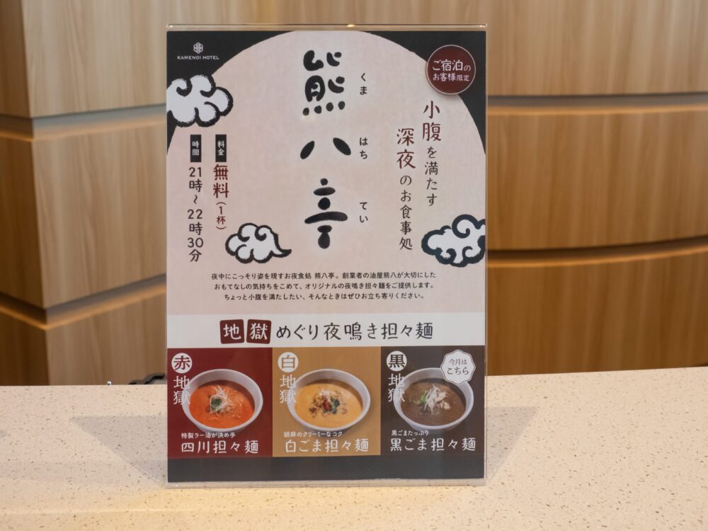 なぜなら、「夜鳴き担々麺」が宿泊者限定でいただけるから!1杯限り無料で21:00~22:30の1時間半のみ提供されています。