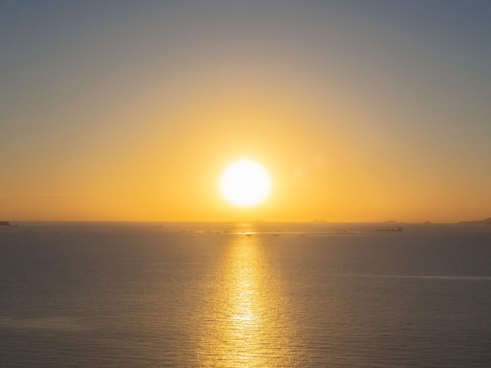 朝、少し早起きするとオーシャンビューの客室やロビーでは朝日が楽しめます。早朝から数多くの船が沖に。漁の真っ最中でしょうか。