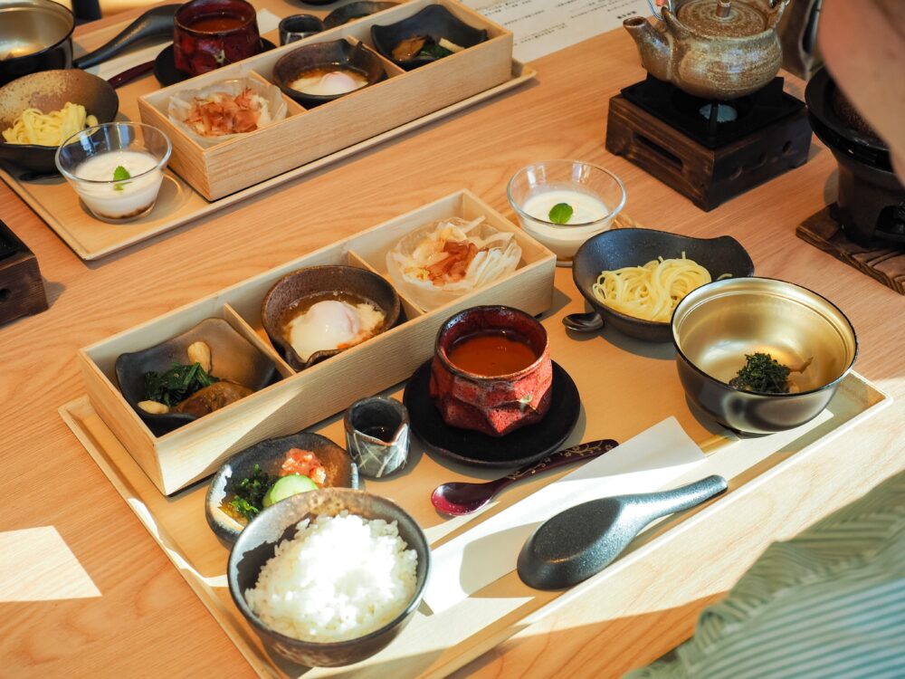 熱々のお出汁を注いで完成するできたての汁物や、夏季の煮物・湯葉豆腐など、どれも控えめな量と優しい味付けで、朝にぴったり。