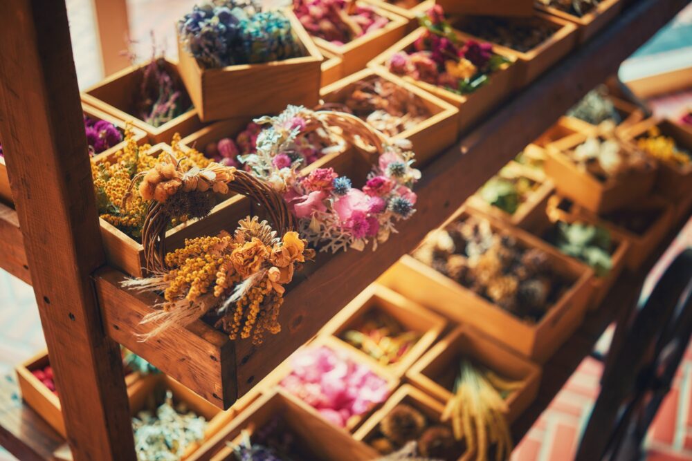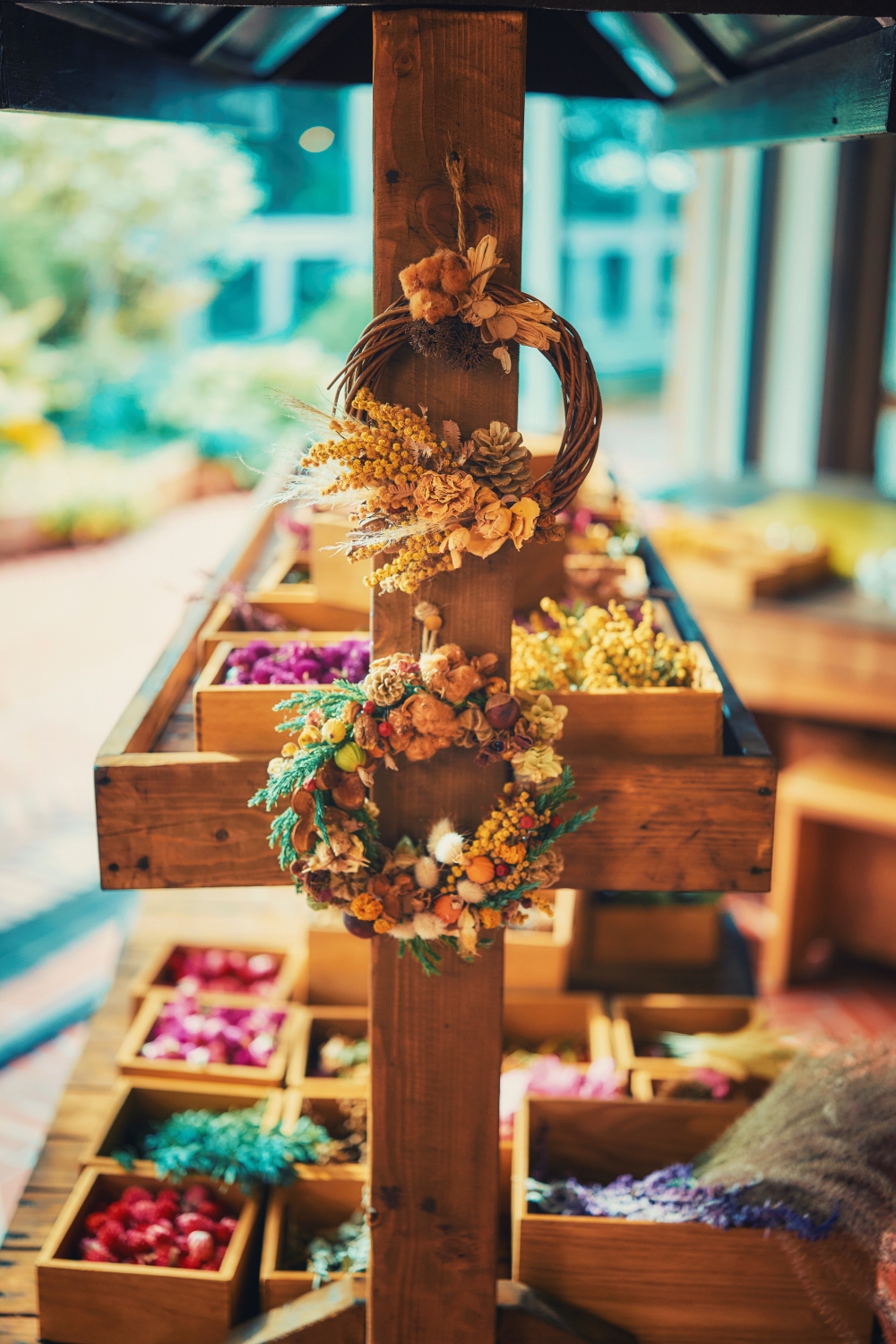 色・形状・大きさ・質感などの異なる約50種のドライフラワーを所定の箱に好きなだけ入れて、リース台とセットで持ち帰ることができます。