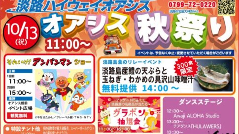 淡路島の玄関口「淡路ハイウェイオアシス」で、『オアシス秋祭り』が開催されます。「アンパンマン」のショーや、具沢山味噌汁の無料提供などを予定しているみたいです。