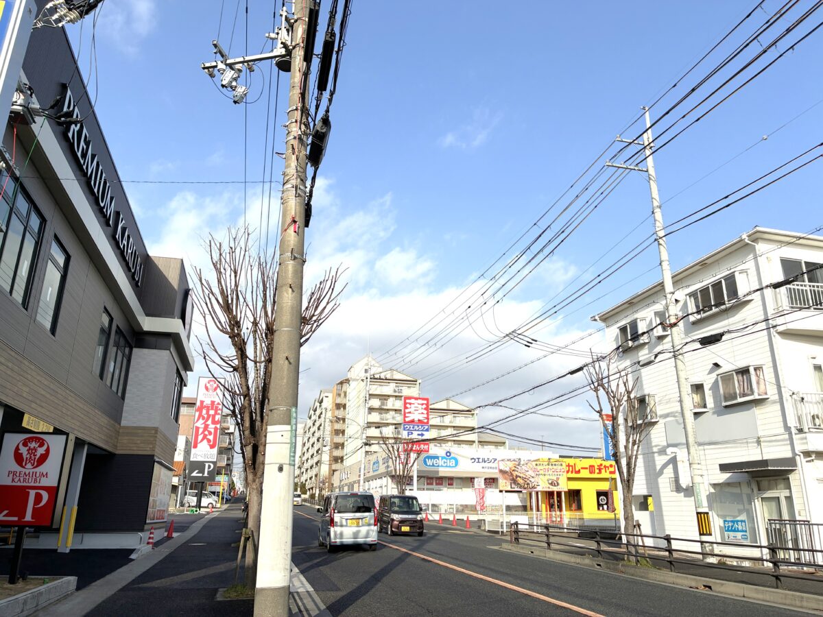 反対を向くとこんな感じ。「カレーのチャンピオン 神戸西店」なども近くにあり、少し進むと「羅生門」やスーパーマーケット「マルアイ」なども見えてきます。