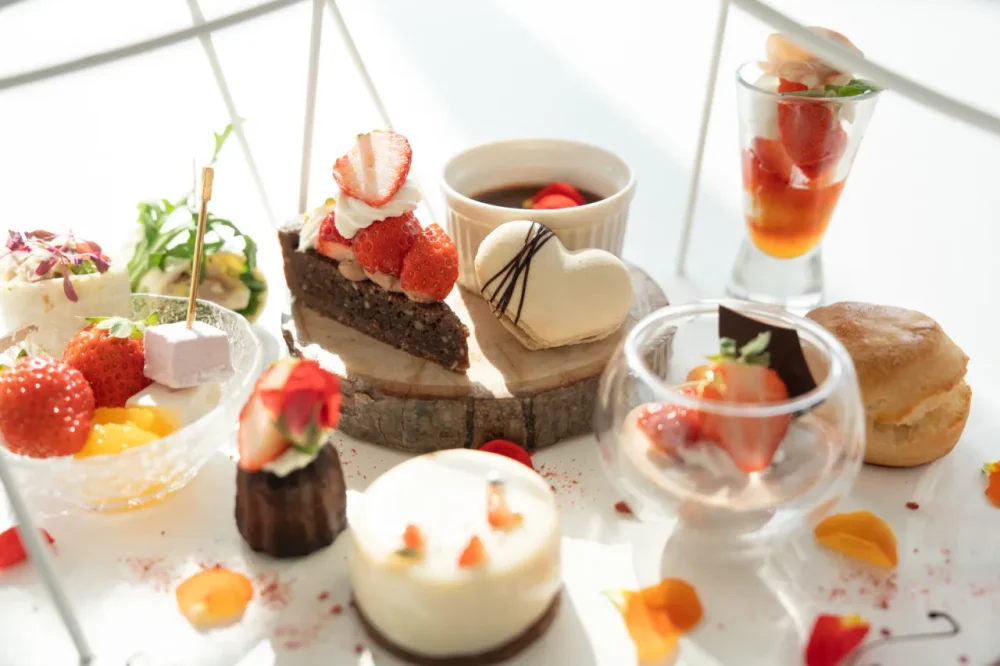 ハートのマカロンやショコラモンブランに、苺やギモーヴを付けて味わうチョコフォンデュなど、パティシエ特製スイーツが勢揃いです。