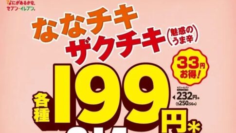 コンビニエンスストア「セブン-イレブン」で、「ななチキ」、「ザクチキ(魅惑のうま辛)」が、通常価格から33円引きの特別価格で販売されます。