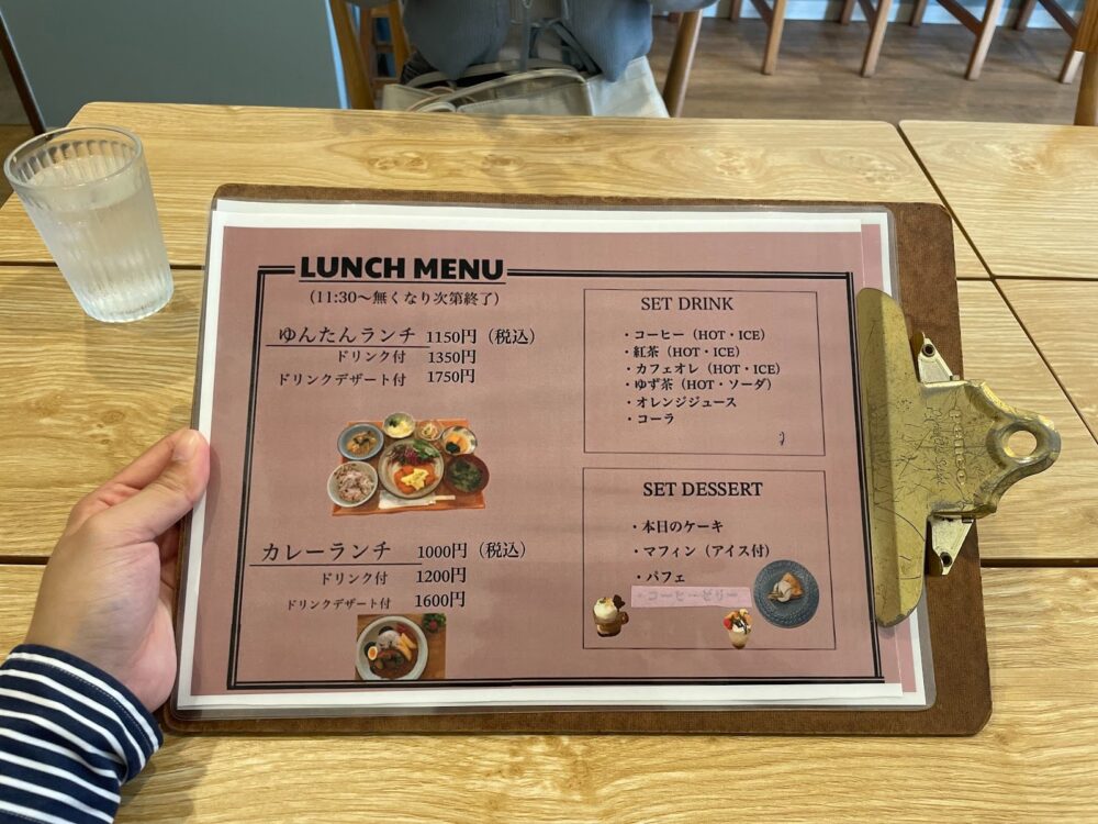 ランチメニューは「日替わりのゆんたんランチ(税込1,150円)」と「カレーランチ(税込1,000円)」の2種類があります。どちらのメニューも、ドリンク付・ドリンクデザート付のセットにすることができます。