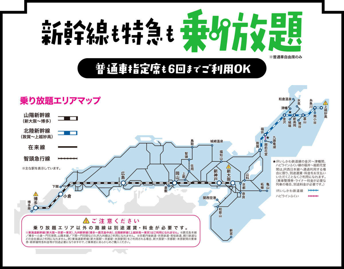今回発売される『WESTER ポイント全線フリーきっぷ』では、JR 西日本全線と智頭急行線の普通列車(新快速・快速を含む)、新幹線、特急列車の普通車自由席が乗り放題となります。普通車指定席も6回まで利用可能。※一部列車は全車指定席。寝台列車など一部列車・設備は除く
