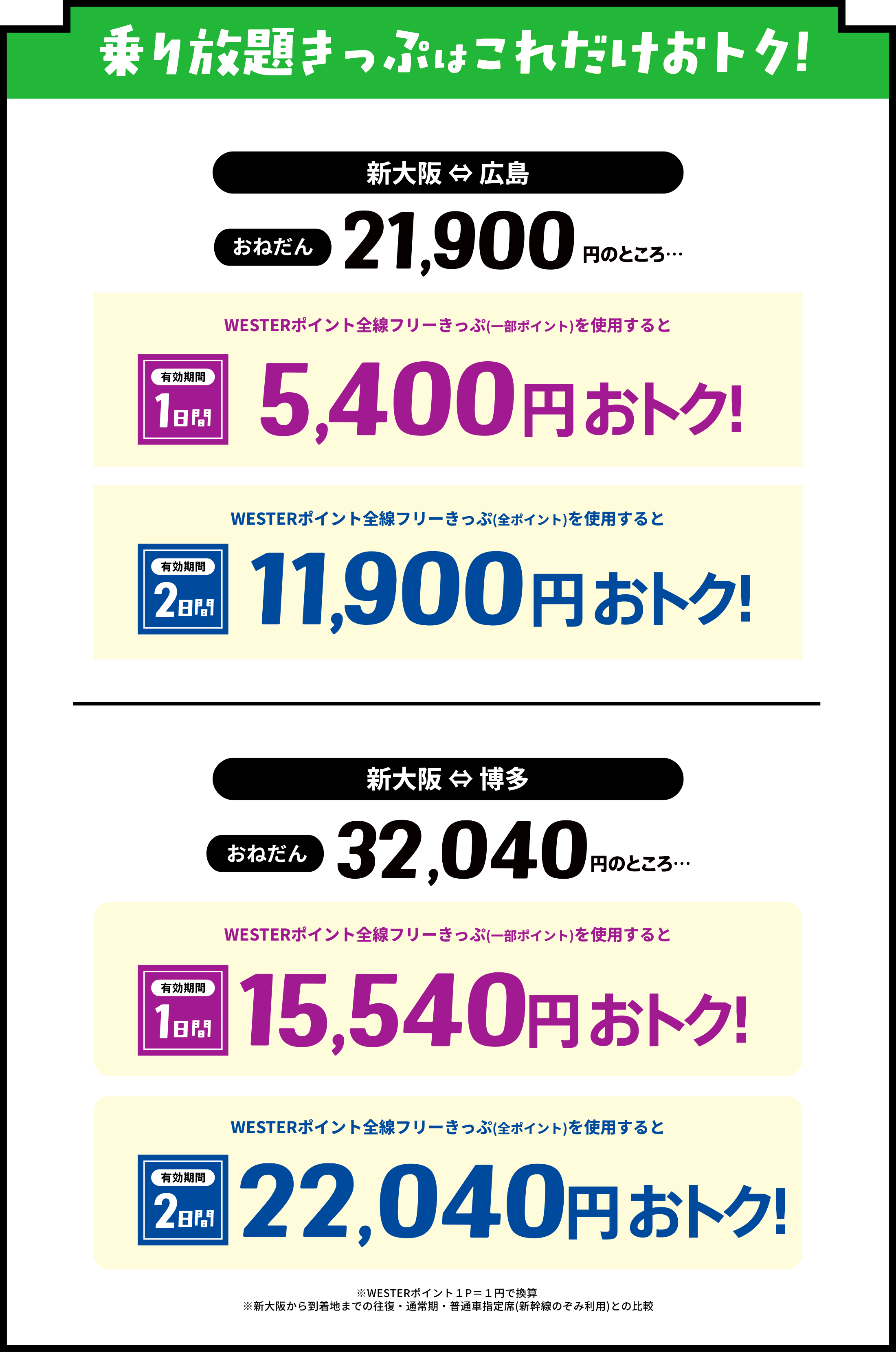 | 商品名 | WESTER ポイント全線フリーきっぷ (全ポイント) | WESTER ポイント全線フリーきっぷ (一部ポイント) |