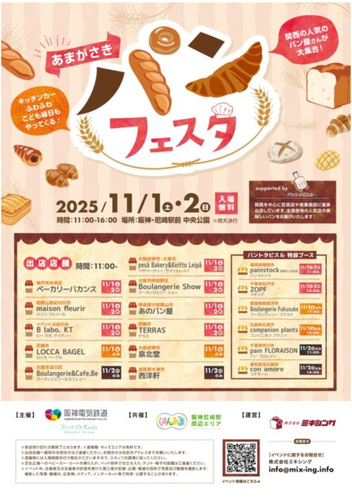 全17のベーカリーが集結する『あまがさきパンフェスタ』が開催されるみたい。キッチンカーやキッズエリアも