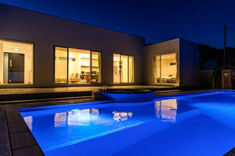 プライベートプールと屋外温水ジャグジーを備えているのも大きな特長。夜には水中照明が幻想的に輝き、特別なひとときを過ごすことができます。