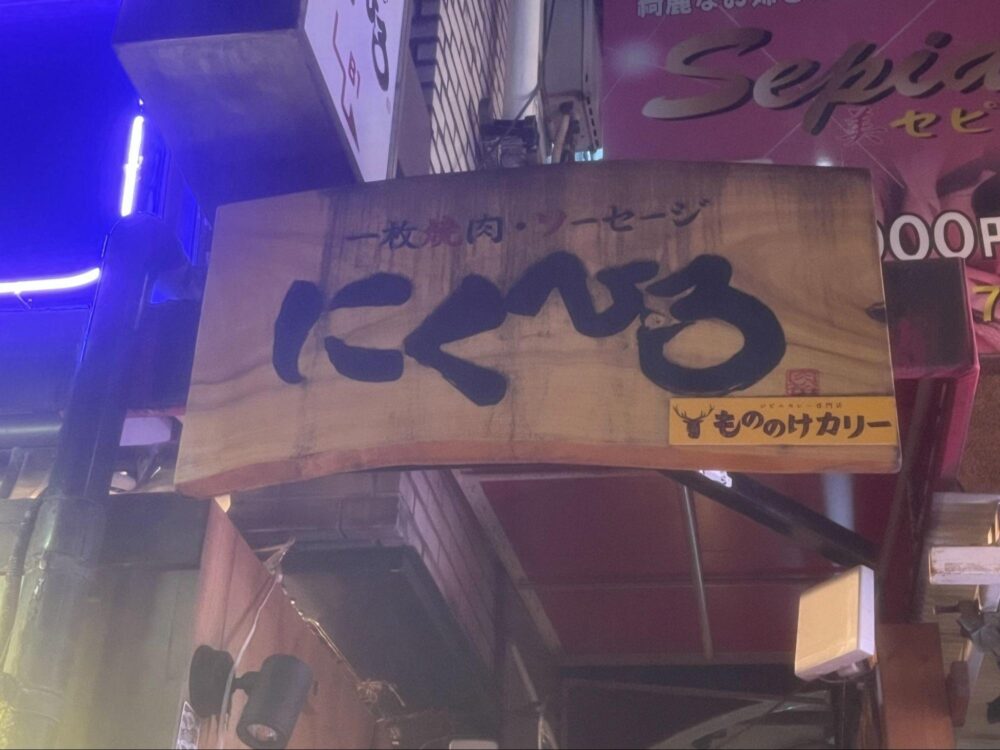 木製の「にくひろ」看板の奥にある階段を降りて店内へ向かいます。