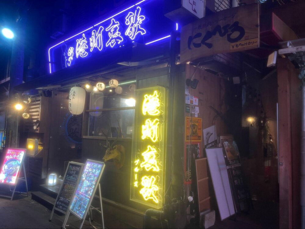 今回は阪急神戸三宮駅西口から徒歩2分にある『ジビエ焼鳥 港町ブルース ~にくひろ はなれ〜 三宮店』へ行ってみます。青や黄色のネオンに包まれた外観のお店がお出迎え。