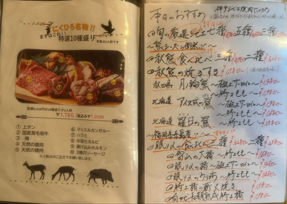 一番人気は「にくひろ名物!! 特選10種盛り」。ジビエ初挑戦の人はランキング形式でまとめてくれてると選びやすいですよね。