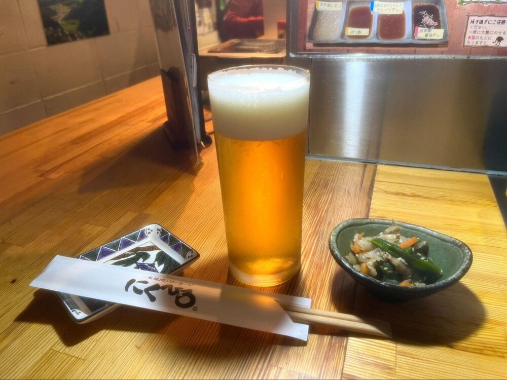 やっぱり「とりあえず生で!」ということで「生ビール アサヒマルエフ(550円)」を注文。お通しとの相性も良く、よりお肉が楽しみになる瞬間です。