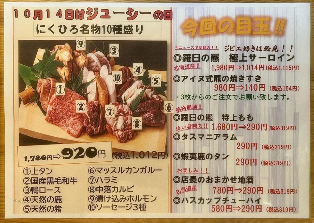 毎月14日(ジューシーの日)と29日(肉の日)は、人気メニューの「にくひろ名物!! 特選10種盛り」をはじめ、いろんなメニューがお手頃価格でいただけます。内容も毎回変わるので飽きることもありません。