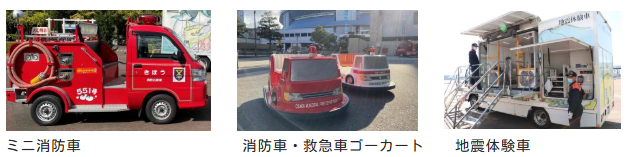 大阪市消防局による防火防災キャンペーンとして、起震車で震度7の地震を体験したり、ミニ消防車に乗って写真撮影ができます。消防車型ゴーカートでも遊べます。