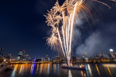 八軒家浜前の大川水上から、玩具花火300発が次々と打ち上がります。中之島のビル群がきらめく夜景を背景に、水辺ならではの華やかな光景を楽しめるみたい。観覧無料。