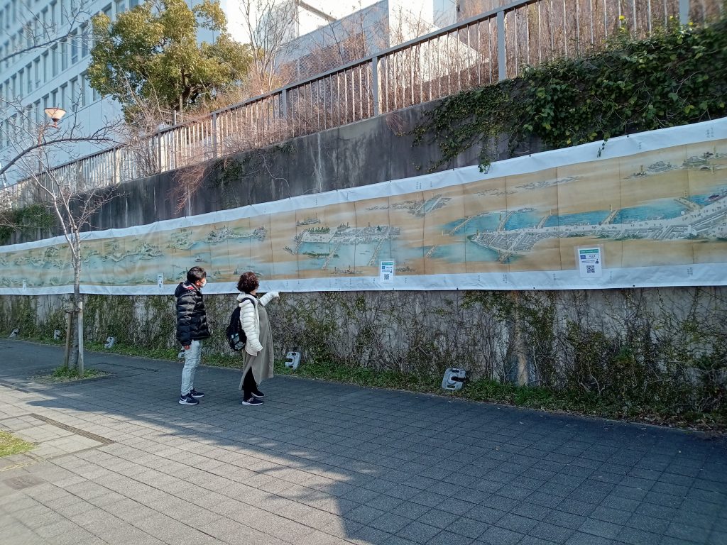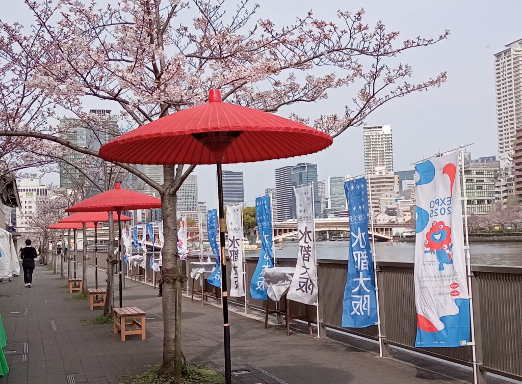 大川さくらクルーズに来た人に、陸上からもお花見を楽しんでもらえるよう、「淀川絵巻」タペストリーの展示や、野点傘と長椅子を設置してくつろぎの空間が創出されます。