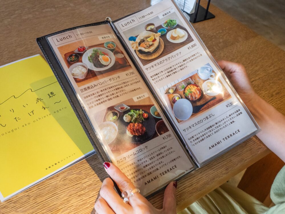 まずは、最寄りのバス停「御崎」から徒歩1分のところ、伊和都比売(いわつひめ)神社の境内にあるカフェ『AMAMI TERRACE(アマミテラス)』へ。