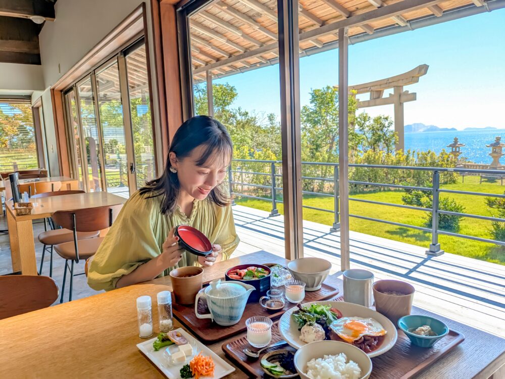 神社の鳥居と海と空を楽しめる「おしゃれカフェ」