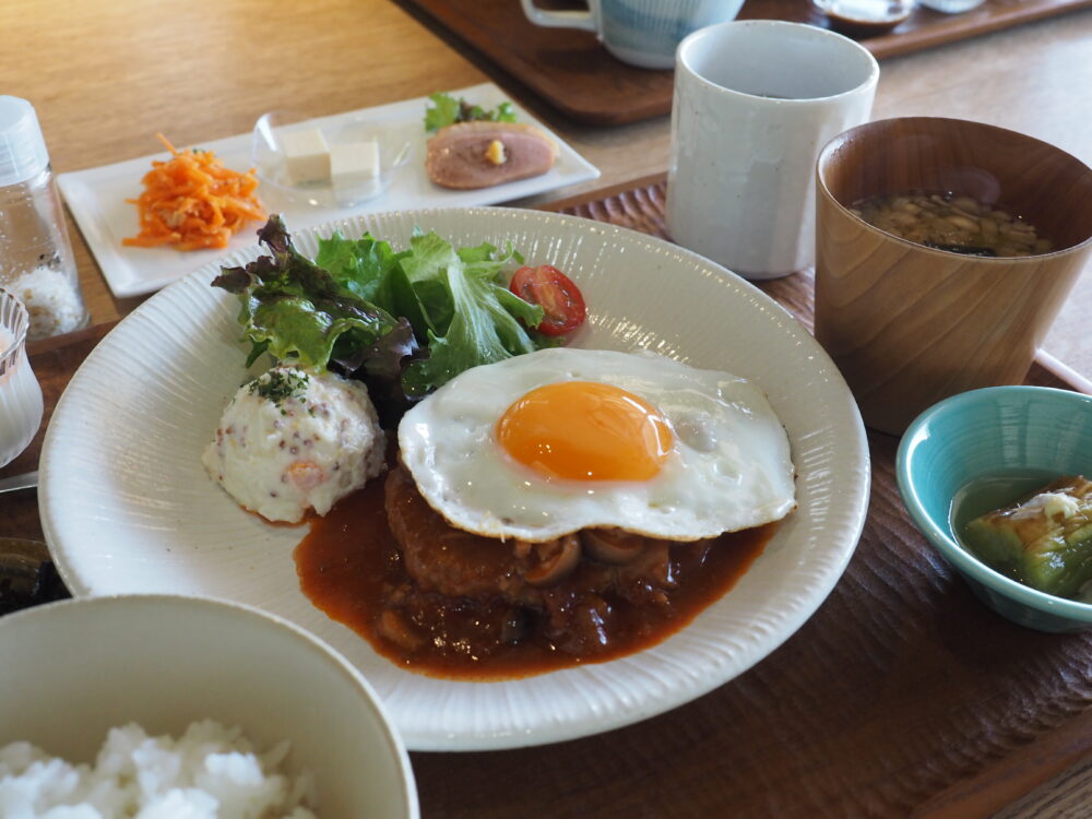 ハンバーグの中には蓮根が入っていて、シャキシャキの食感が楽しい。半熟の目玉焼きも食欲をそそります。