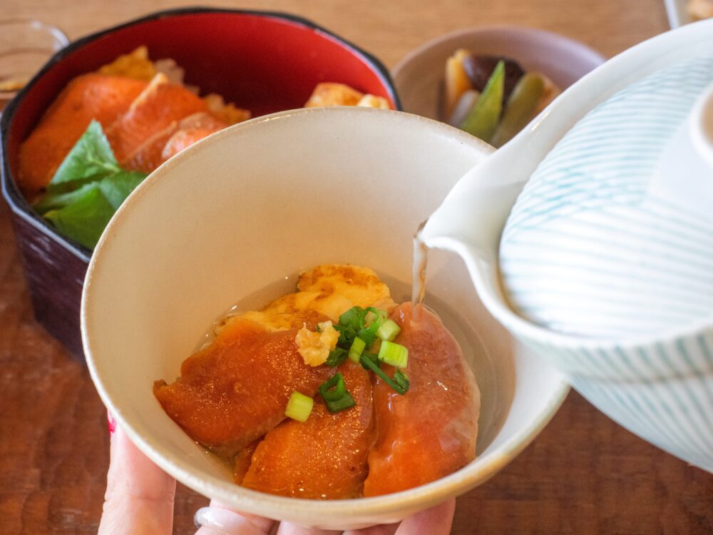 「サツキマスのひつまぶし(2,500円)」が到着!サツキマスのオレンジ色が鮮やかで、どんな味なんだろうと期待が膨らみます。