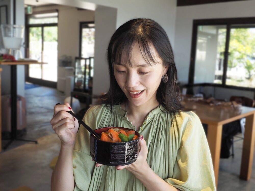 ごま醤油に漬け込まれているサクラマスは香ばしい味わいで、脂身は爽やかです。