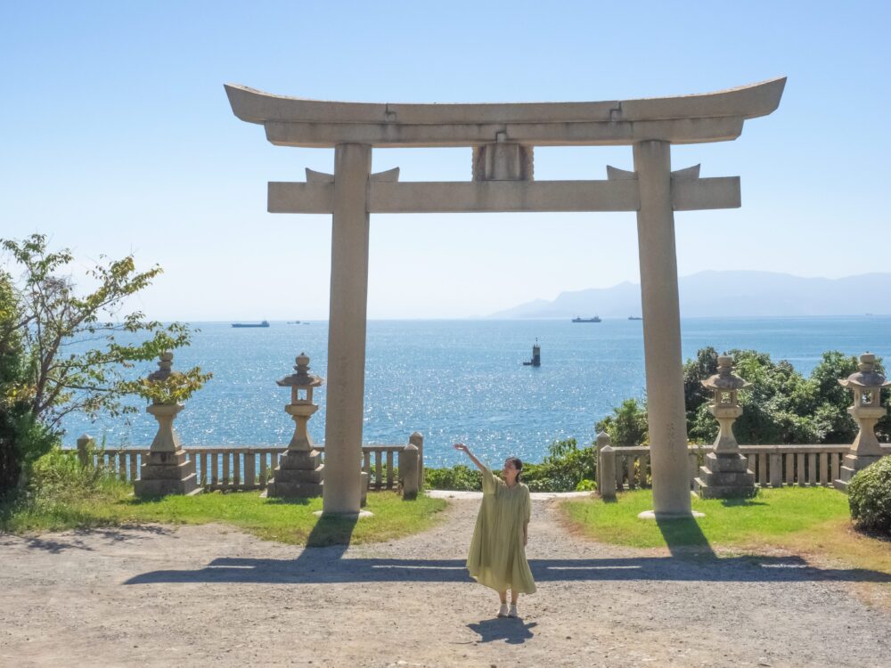 帰路につこうと振り返って歩くと、鳥居越しに瀬戸内海を望む絶景が現れます。「日本の夕陽百選」にも選ばれたスポットで、写真をパシャリ。