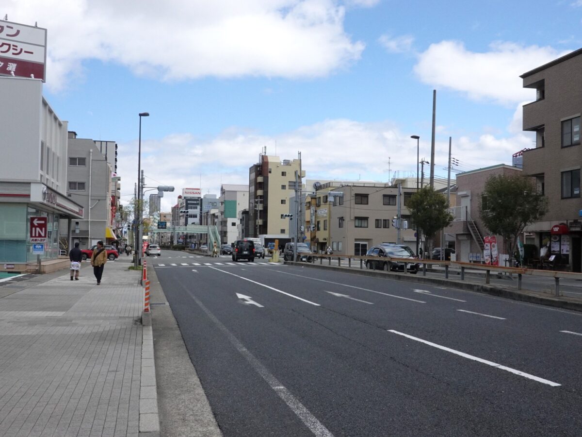 反対側を向くと、出光のガソリンスタンド「セルフ大石川SS」や、ホームセンター「コーナン」、回転寿司チェーン「くら寿司」が見えます。さらに進むとJR摩耶駅もあります。