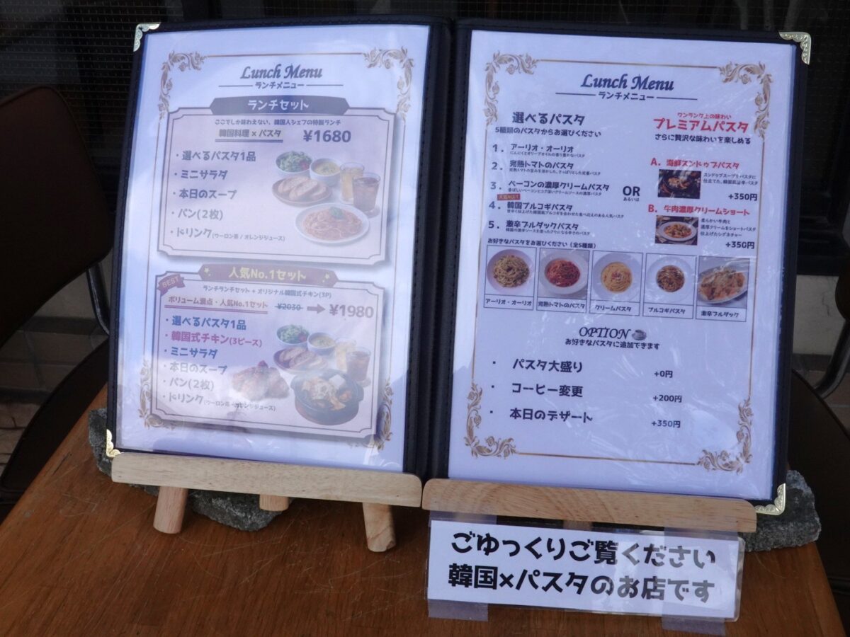 ランチセットの選べるパスタは「アーリオ・オーリオ」「完熟トマトのパスタ」や「ベーコンの濃厚クリームパスタ」から、韓国料理スタイルの「韓国プルコギパスタ」「激辛プルダックパスタ」「海鮮スンドゥブパスタ」などが楽しめるそうです。パスタ大盛も無料でできるみたい。