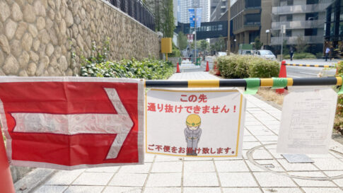白い壁でふさがれ青い大きな表示が貼られていますが、遠くからパッと見で工事中という感じがないので、すぐ近くまで行って「通れへんやん」となっている人が結構いました。